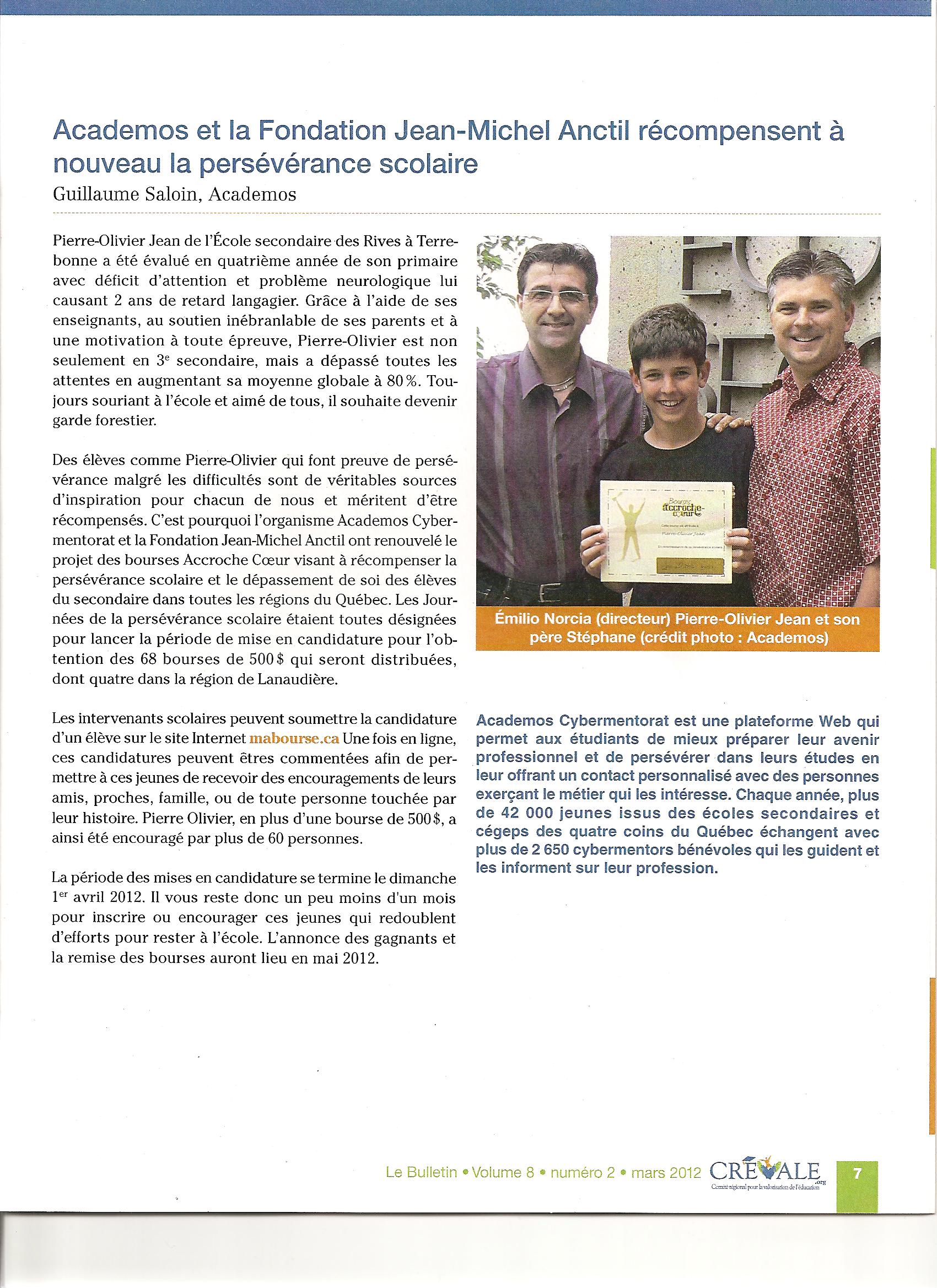 Academos et la Fondation Jean-Michel Anctil récompensent à nouveau la persévérance scolaireLe bulletin, CRÉVALE, Vol. 8, No 2Mars 2012