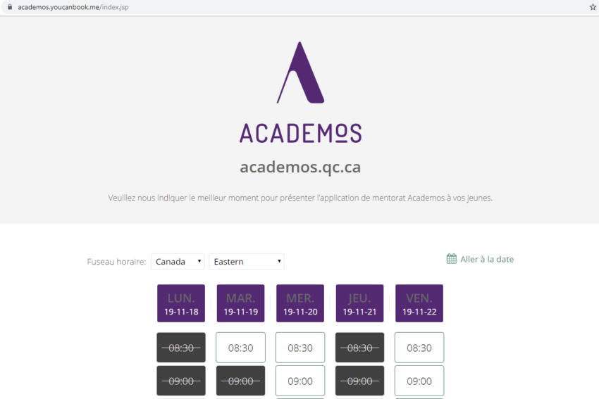 Il est maintenant possible de réserver par vous-même des ateliers virtuels dans vos classes. C’est simple et rapide : vous n’avez qu’à choisir un des cinq ateliers (Découvrez Academos, Le boss, c’est toi!, les STEGMA, démystifie la FP et bonheur au travail) et à cliquer sur le bouton « Réserver ».